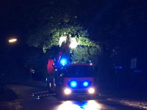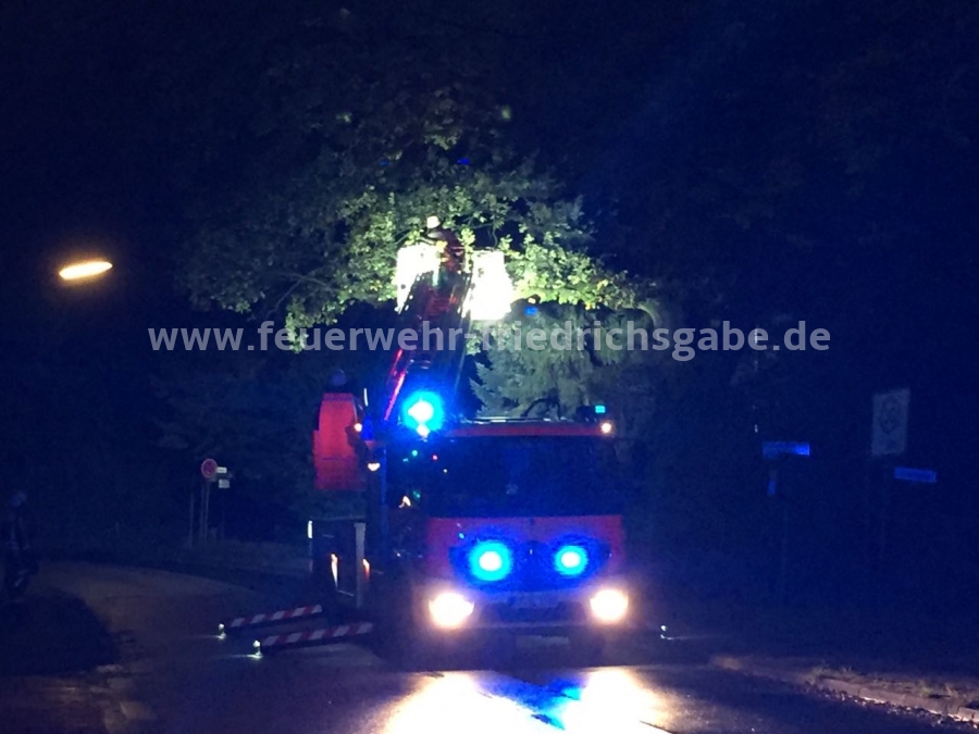 Größerer Ast in ca. 8m Höhe über der Fahrbahn abgebrochen. Mit Kettensäge von der Drehleiter entfernt.