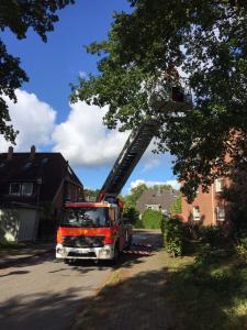 Nachforderung der Drehleiter durch die Hauptamtliche Wachabteilung. Großen Ast, welcher auf Gehweg zu stürzen drohte, mittles Kettensäge aus dem Korb der Drehleiter entfernt.