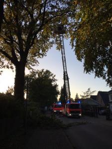 Drohen zwei große Äste aus ca 15m Höhe auf Straße und Gehweg zu stürzen, mittels Kettensäge von der Drehleiter abgetragen.