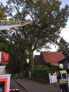 Ast in 8m Höhe mittels Kettensäge aus Drehleiter entfernt.