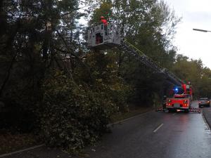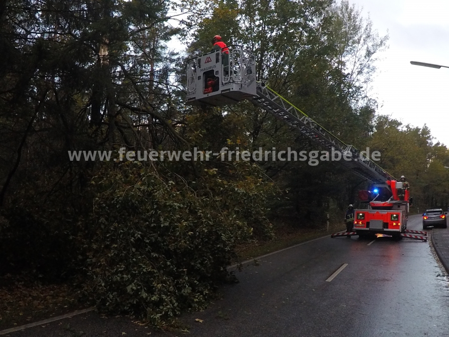 Abgebrochener Ast ragt in die Fahrbahn, mit Kettensäge aus Drehleiter entfernt.