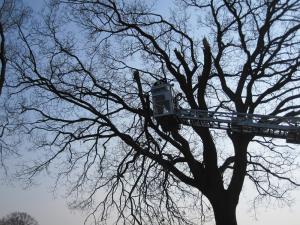Im Bereich der Einsatzstelle Lütte Lohe wurde ein in 8m Höhe hängender, großer abgeknickter Ast einer Eiche mit Kettensäge aus der Drehleiter entfernt.