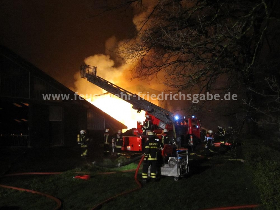 Brandbekämpfung über Drehleiter und mit Atemschutztrupps. Einsatzdauer für die FF Friedrichsgabe bis ca. 9:30 Uhr.