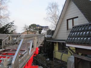 Für den Rettungsdienst wurde ein Patient mit der Drehleiter aus dem Obergeschoss gerettet.