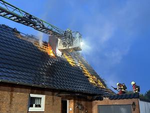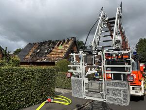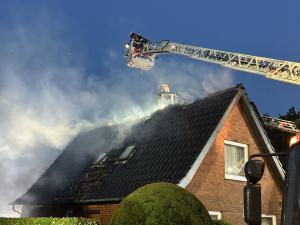 Unterstützung der FF Quickborn bei einem Dachstuhlbrand. Unter Atemschutz wurde von der Drehleiter das Dach abgedeckt und der Dachstuhl abgetragen. Desweiteren wurde der Abrollbehälter Dekontamination zur Einsatzstellenhygiene betrieben.